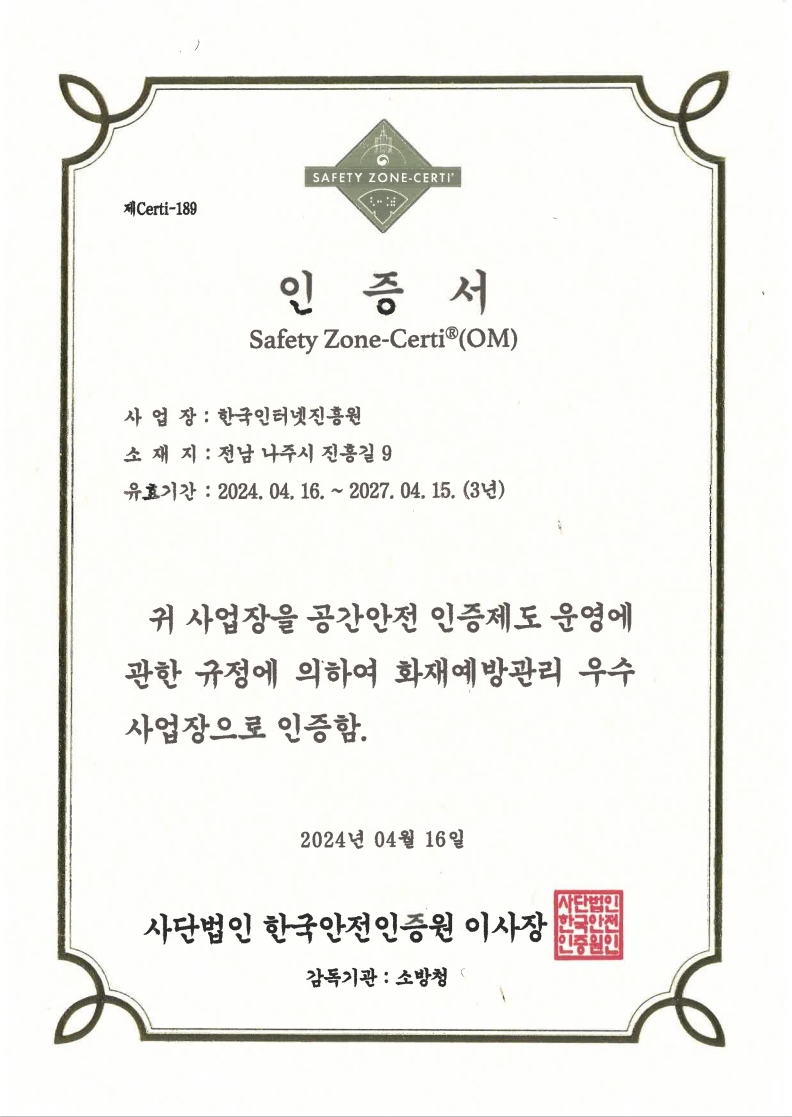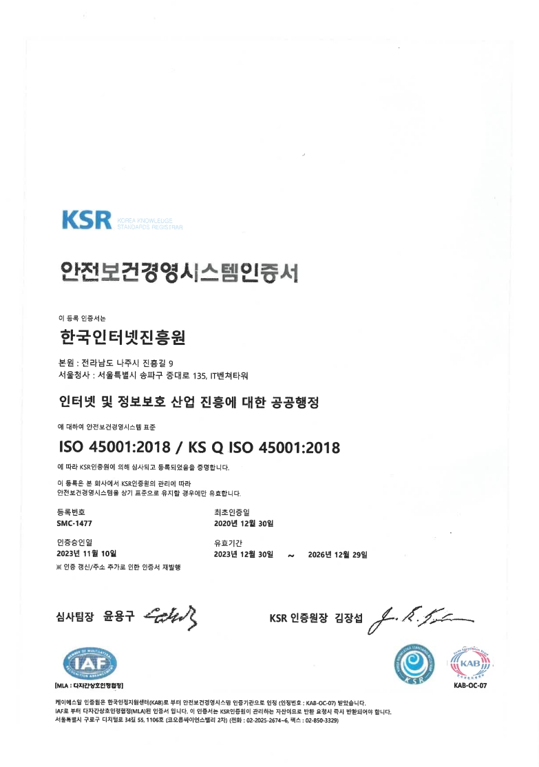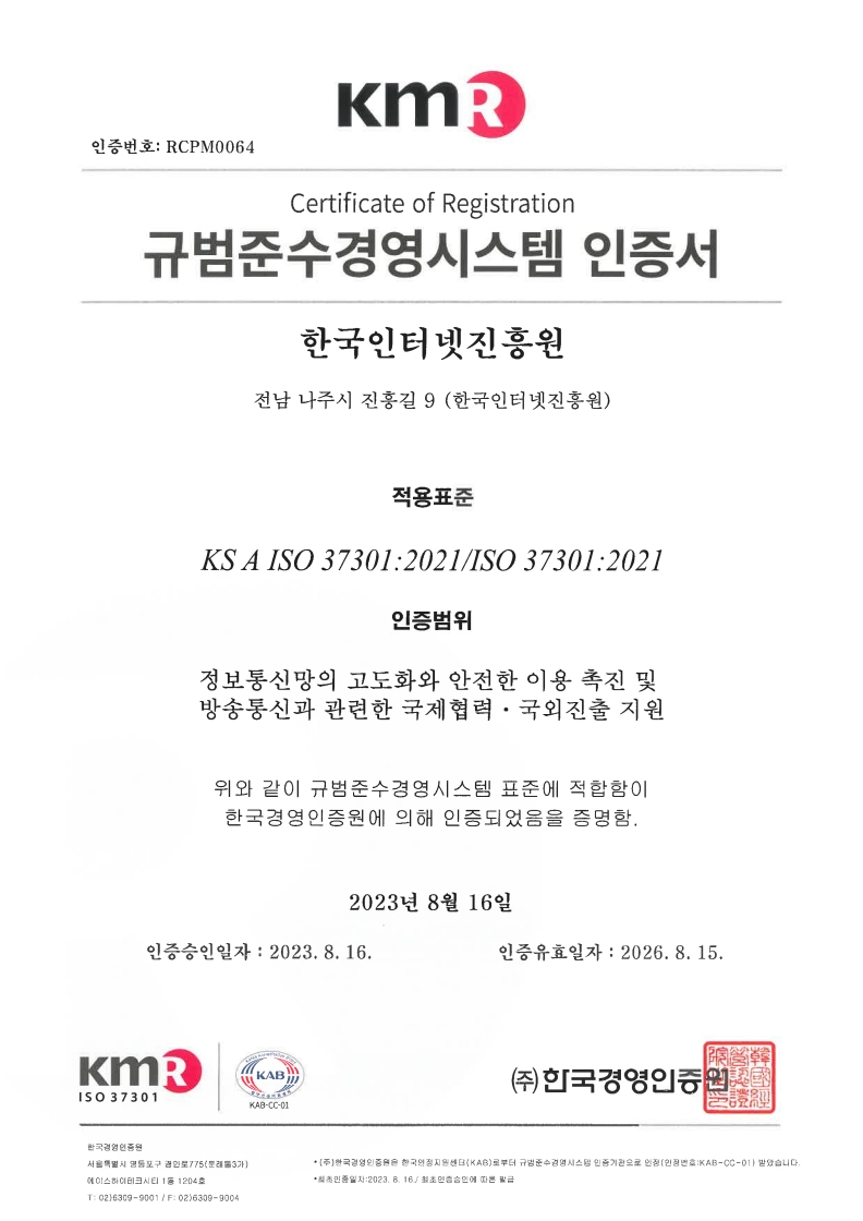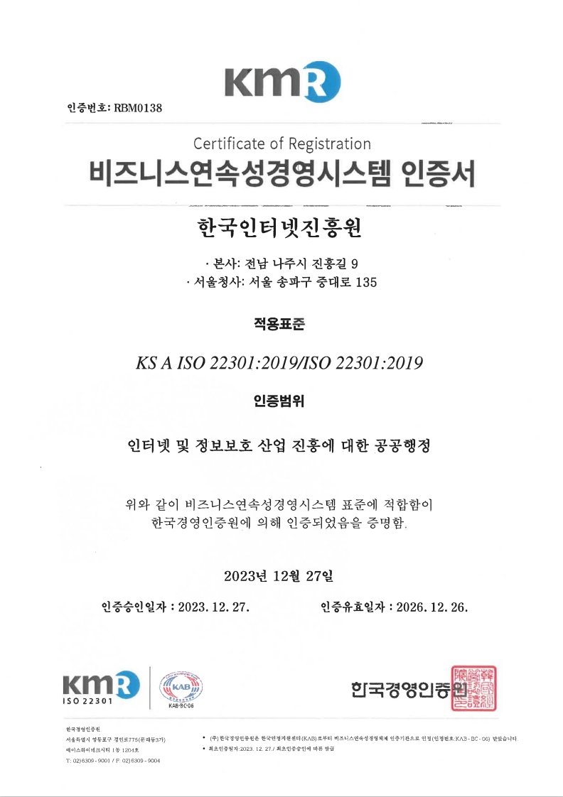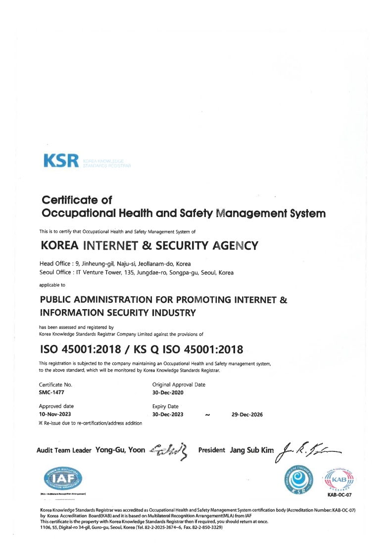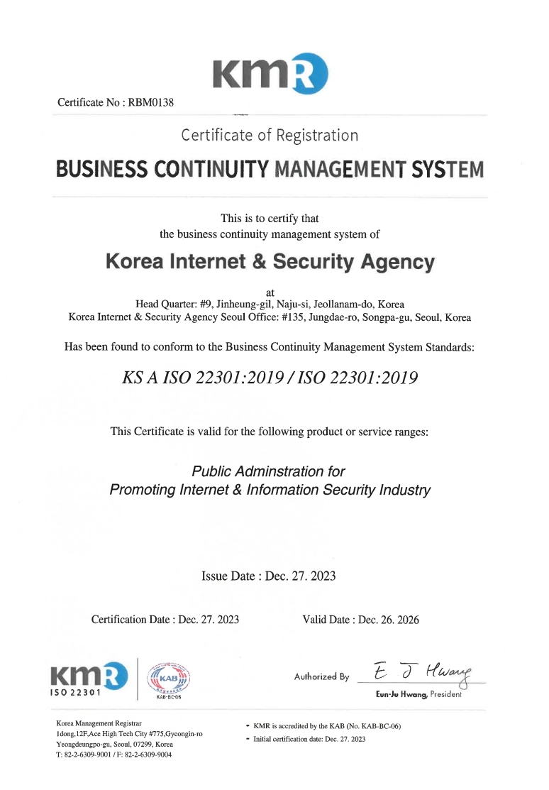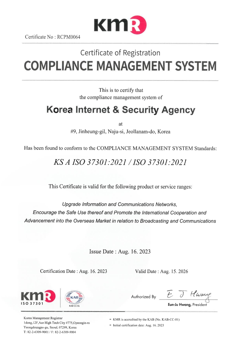 [나주본원] (58324) 전라남도 나주시 진흥길 9 한국인터넷진흥원 대표번호 : 1433-25(수신자 요금 부담) [서울청사] (05717) 서울시 송파구 중대로 135 (가락동) IT벤처타워 [해킹ㆍ스팸개인정보침해 118] Copyright(C) 2021 KISA. All rights reserved.